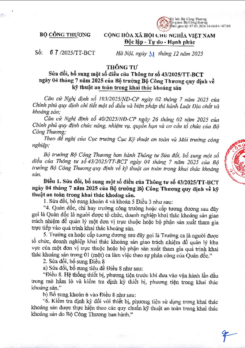 | Tiêu đề văn bản | Thông tư sửa đổi, bổ sung một số điều của Thông tư số 43/2025/TT-BCT ngày 04 tháng 7 năm 2025 của Bộ trưởng Bộ Công Thương quy định về kỹ thuật an toàn trong khai thác khoáng sản | ||