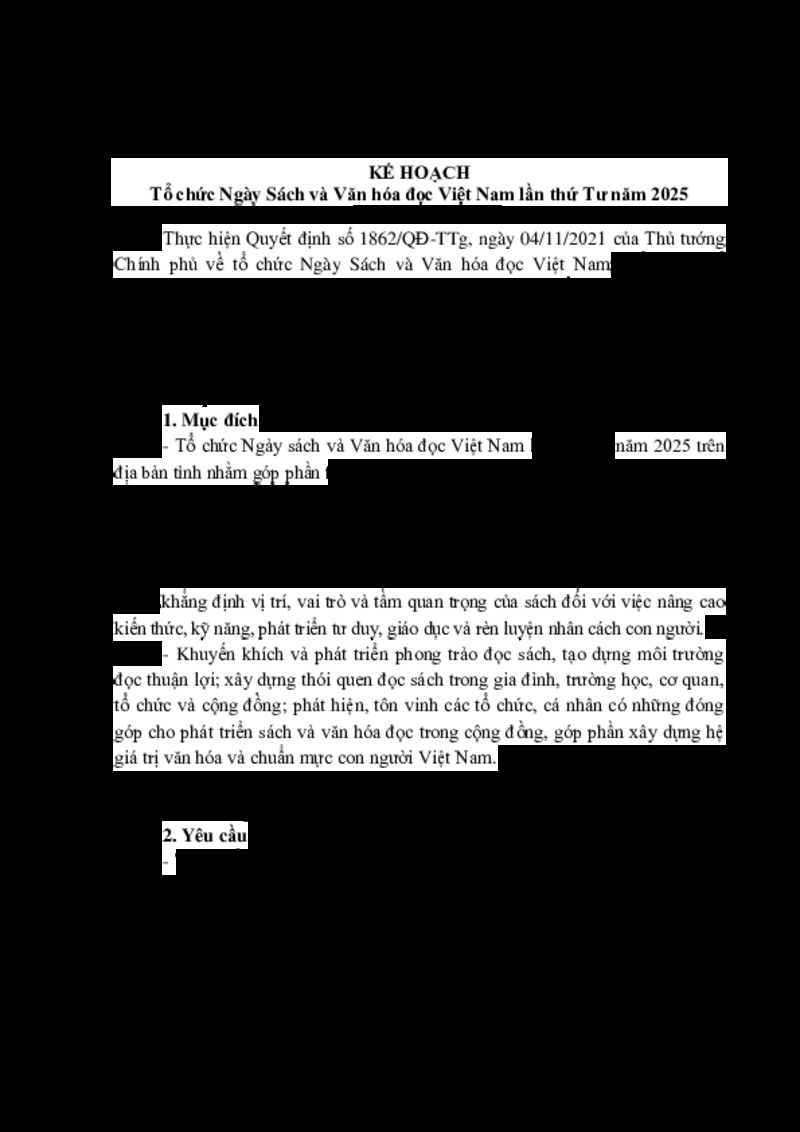 Tiêu đề văn bản | Kế hoạch tổ chức Ngày Sách và Văn hóa đọc Việt Nam lần thứ Tư năm 2025 | ||