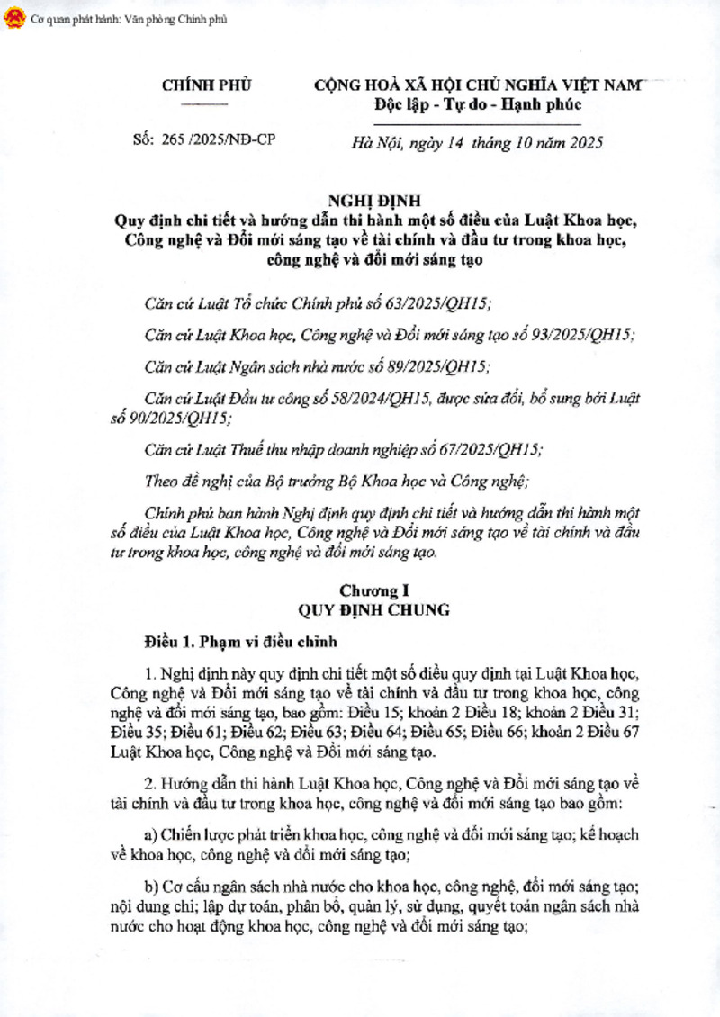 | Tiêu đề văn bản | Nghị định quy định chi tiết và hướng dẫn thi hành một số điều của Luật Khoa học, Công nghệ và Đổi mới sáng tạo về tài chính và đầu tư trong khoa học, công nghệ và đổi mới sáng tạo | ||