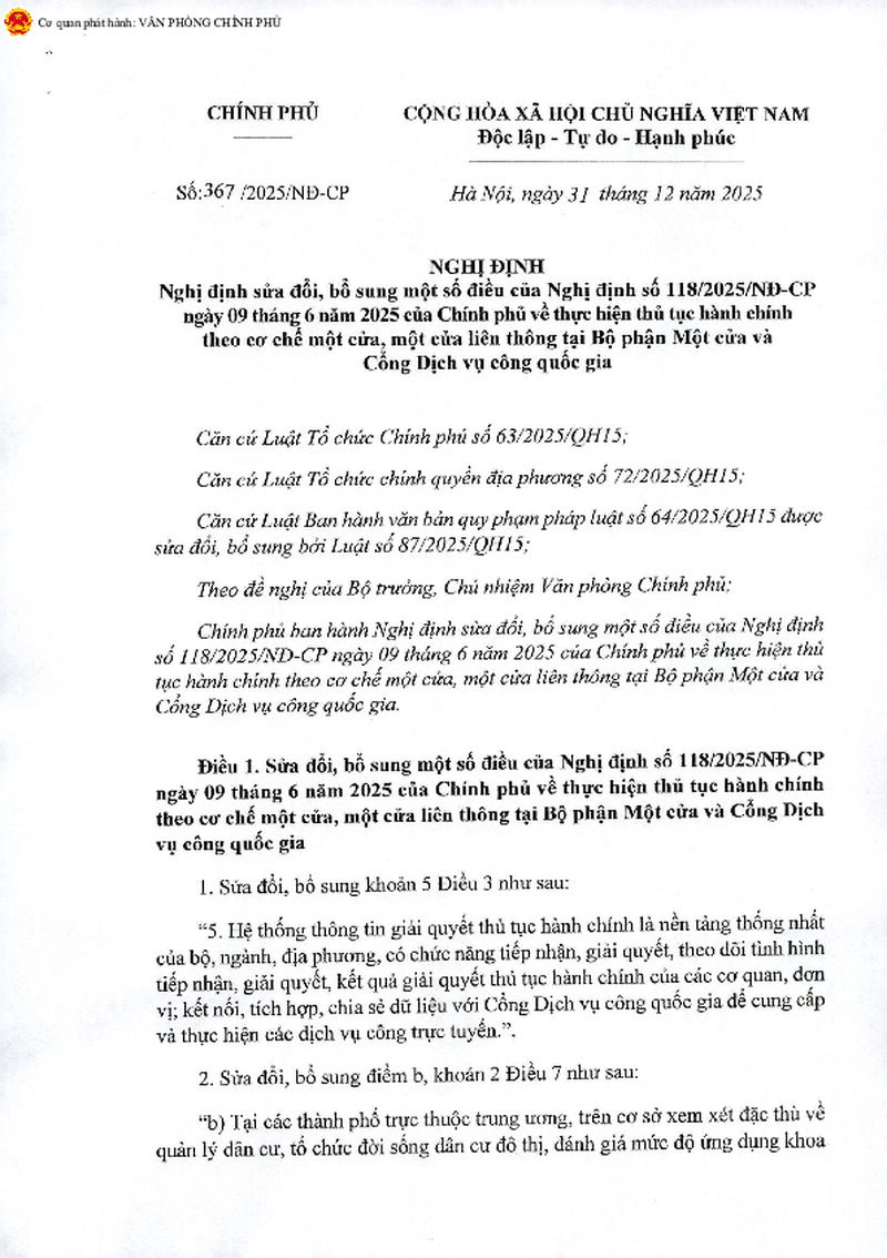 | Tiêu đề văn bản | Nghị định sửa đổi, bổ sung một số điều của Nghị định số 118/2025/NĐ-CP ngày 09/6/2025 của Chính phủ về thực hiện TTHC theo cơ chế một cửa, một cửa liên thông tại Bộ phận một cửa và Cổng Dịch vụ công quốc gia | ||