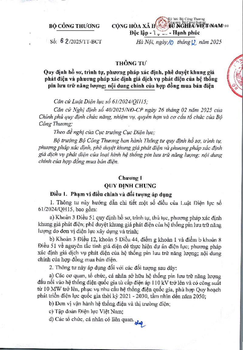 | Tiêu đề văn bản | Thông tư 62/2025/TT-BCT khung giá phát điện và phương pháp xác định giá dịch vụ phát điện của hệ thống pin lưu trữ năng lượng | ||