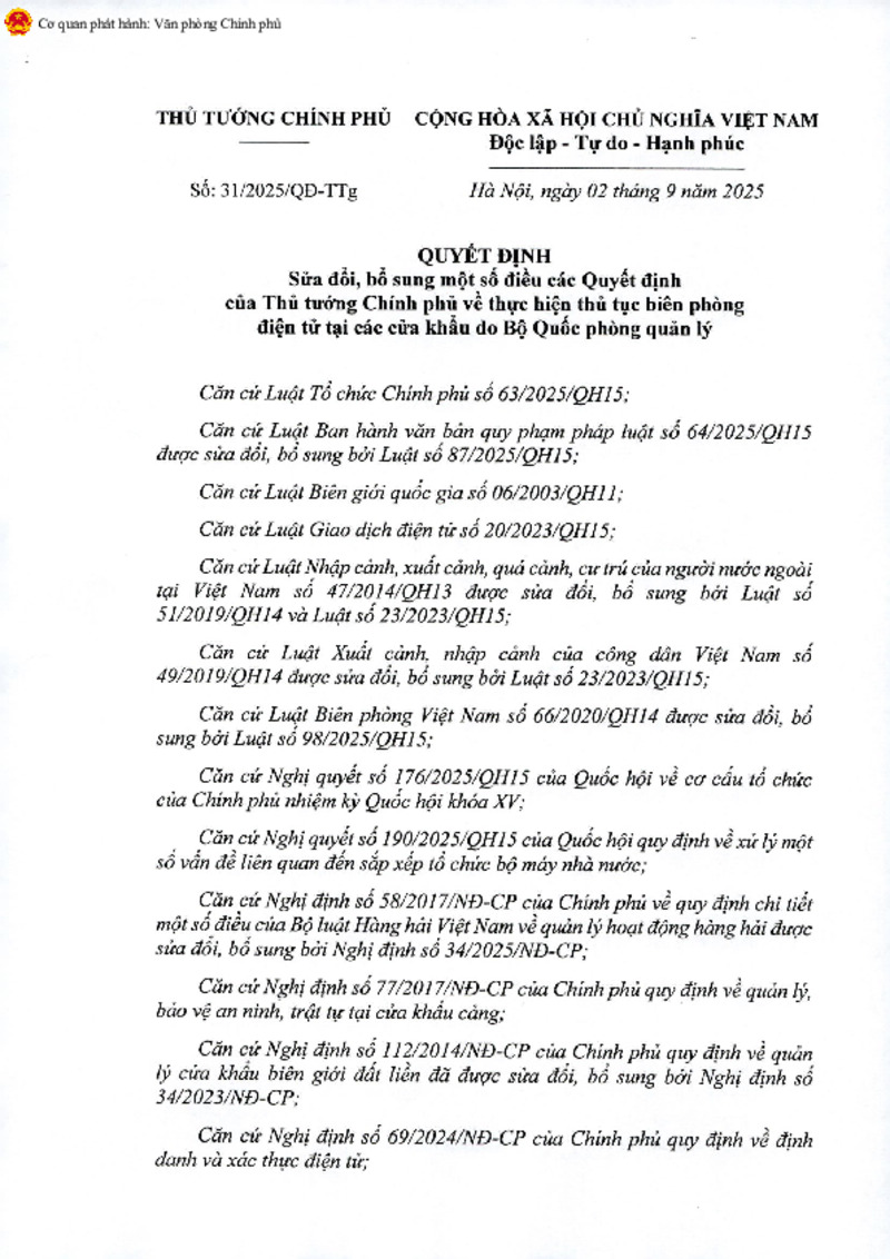 Tiêu đề văn bản | Quyết định sửa đổi, bổ sung một số điều các Quyết định của Thủ tướng Chính phủ về thực hiện thủ tục biên phòng điện tử tại các cửa khẩu do Bộ Quốc phòng quản lý | ||