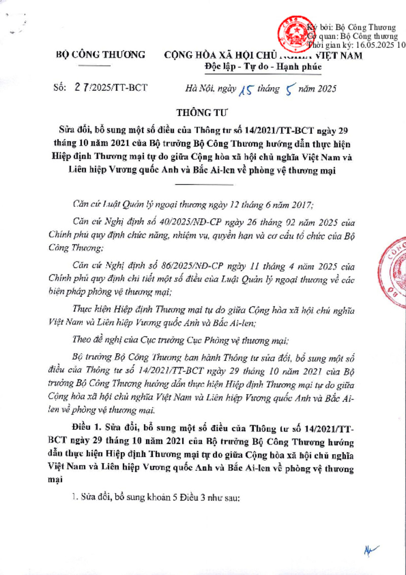 Liên hiệp Vương quốc Anh và Bắc Ai-len về phòng vệ thương mại; Thông tư số 28/2025/TT-BCT Sửa đổi, bổ sung một số điều của Thông tư số 30/2020/TT-BCT ngày 26 tháng 11 năm 2020 của Bộ trưởng Bộ Công Thương hướng dẫn thực hiện Hiệp định Thương mại tự do giữa Cộng hòa xã hội chủ nghĩa Việt Nam và Liên minh châu Âu về phòng vệ thương mại; Thông tư số 29/2025/TT-BCT Sửa đổi, bổ sung một số điều của Thông tư số 07/2022/TT-BCT ngày 23 tháng 03 năm 2022 của Bộ trưởng Bộ Công Thương hướng dẫn thực hiện Hiệp định các biện pháp phòng về thương mại trong Hiệp định Đối tác Kinh tế Toàn diện Khu vực; Thông tư số 30/2025/TT-BCT Sửa đổi, bổ sung một số điều của Thông tư số 19/2019/TT-BCT ngày 30 tháng 9 năm 2019 của Bộ trưởng Bộ Công Thương quy định về áp dụng các biện pháp tự vệ đặc biệt để thực thi Hiệp định Đối tác Toàn diện và Tiến bộ xuyên Thái Bình Dương.