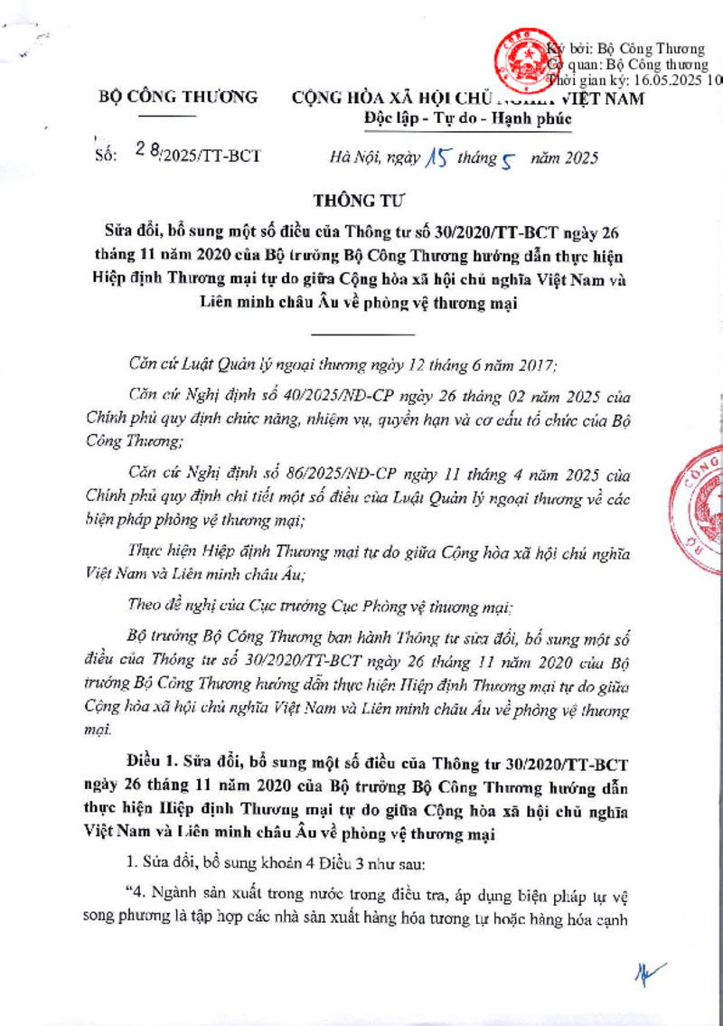 Ngày 15/5/2025, Bộ Công Thương đã ban hành các Thông tư số 26/2025/TT-BCT Quy định chi tiết một số nội dung về các biện pháp phòng vệ thương mại; Thông tư số 27/2025/TT-BCT Sửa đổi, bổ sung một số điều của Thông tư số 14/2021/TT-BCT ngày 29 tháng 10 năm 2021 của Bộ trưởng Bộ Công Thương hướng dẫn thực hiện Hiệp định Thương mại tự do giữa Cộng hòa xã hội chủ nghĩa Việt Nam và Liên hiệp Vương quốc Anh và Bắc Ai-len về phòng vệ thương mại; Thông tư số 28/2025/TT-BCT Sửa đổi, bổ sung một số điều của Thông tư số 30/2020/TT-BCT ngày 26 tháng 11 năm 2020 của Bộ trưởng Bộ Công Thương hướng dẫn thực hiện Hiệp định Thương mại tự do giữa Cộng hòa xã hội chủ nghĩa Việt Nam và Liên minh châu Âu về phòng vệ thương mại; Thông tư số 29/2025/TT-BCT Sửa đổi, bổ sung một số điều của Thông tư số 07/2022/TT-BCT ngày 23 tháng 03 năm 2022 của Bộ trưởng Bộ Công Thương hướng dẫn thực hiện Hiệp định các biện pháp phòng về thương mại trong Hiệp định Đối tác Kinh tế Toàn diện Khu vực; Thông tư số 30/2025/TT-BCT Sửa đổi, bổ sung một số điều của Thông tư số 19/2019/TT-BCT ngày 30 tháng 9 năm 2019 của Bộ trưởng Bộ Công Thương quy định về áp dụng các biện pháp tự vệ đặc biệt để thực thi Hiệp định Đối tác Toàn diện và Tiến bộ xuyên Thái Bình Dương.
