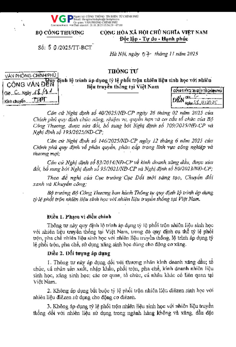 | Tiêu đề văn bản | Thông tư số 50/2025/TT-BCT ngày 07 tháng 11 năm 2025 của Bộ Công Thương quy định lộ trình áp dụng tỷ lệ phối trộn nhiên liệu sinh học với nhiên liệu truyền thống tại Việt Nam trên địa bàn tỉnh Lai Châu | ||