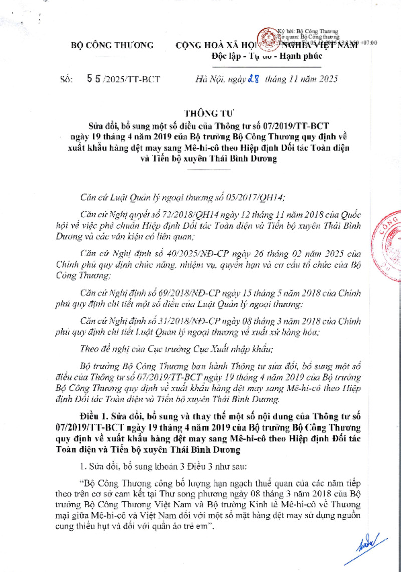 | Tiêu đề văn bản | Thông tư số 55/2025/TT-BCT của BCT: Sửa đổi, bổ sung một số điều của Thông tư số 07/2019/TT-BCT ngày 19 tháng 4 năm 2019 của Bộ trưởng BCT quy định về xuất khẩu hàng dệt may sang Mê-hi-cô theo Hiệp định Đối tác Toàn diện và Tiến bộ xuyên Thái Bình Dương | ||