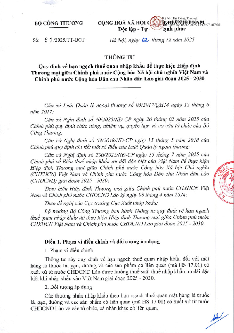 | Tiêu đề văn bản | Thông tư số 61/2025/TT-BCT của Bộ Công thương: Quy định về hạn ngạch thuế quan nhập khẩu để thực hiện Hiệp định Thương mại giữa Chính phủ nước Cộng hòa Xã hội chủ nghĩa Việt Nam và Chính phủ nước Cộng hòa Dân chủ Nhân dân Lào giai đoạn 2025 - 2030 | ||