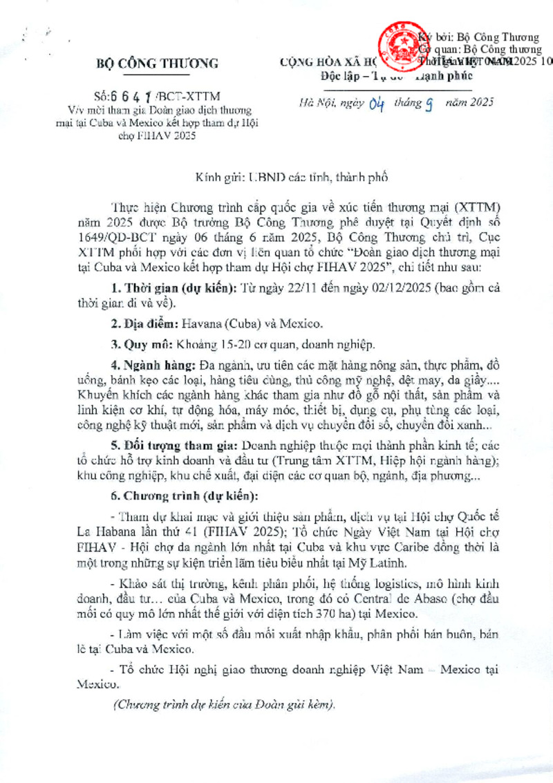 Ngày 22/11/2025-02/12/2025, Bộ Công Thương chủ trì, Cục Xúc tiến thương mại phối hợp với các cơ quan liên quan tổ chức “Đoàn giao dịch thương mại tại Cuba và Mexico kết hợp tham dự Hội chợ FIHAV 2025” để tham dự khai mạc và giới thiệu sản phẩm, dịch vụ tại Hội chợ Quốc tế La Habana lần thứ 41 (FIHAV 2025); tổ chức Ngày Việt Nam tại Hội chợ FIHAV - Hội chợ đa ngành lớn nhất tại Cuba và khu vực Caribe…