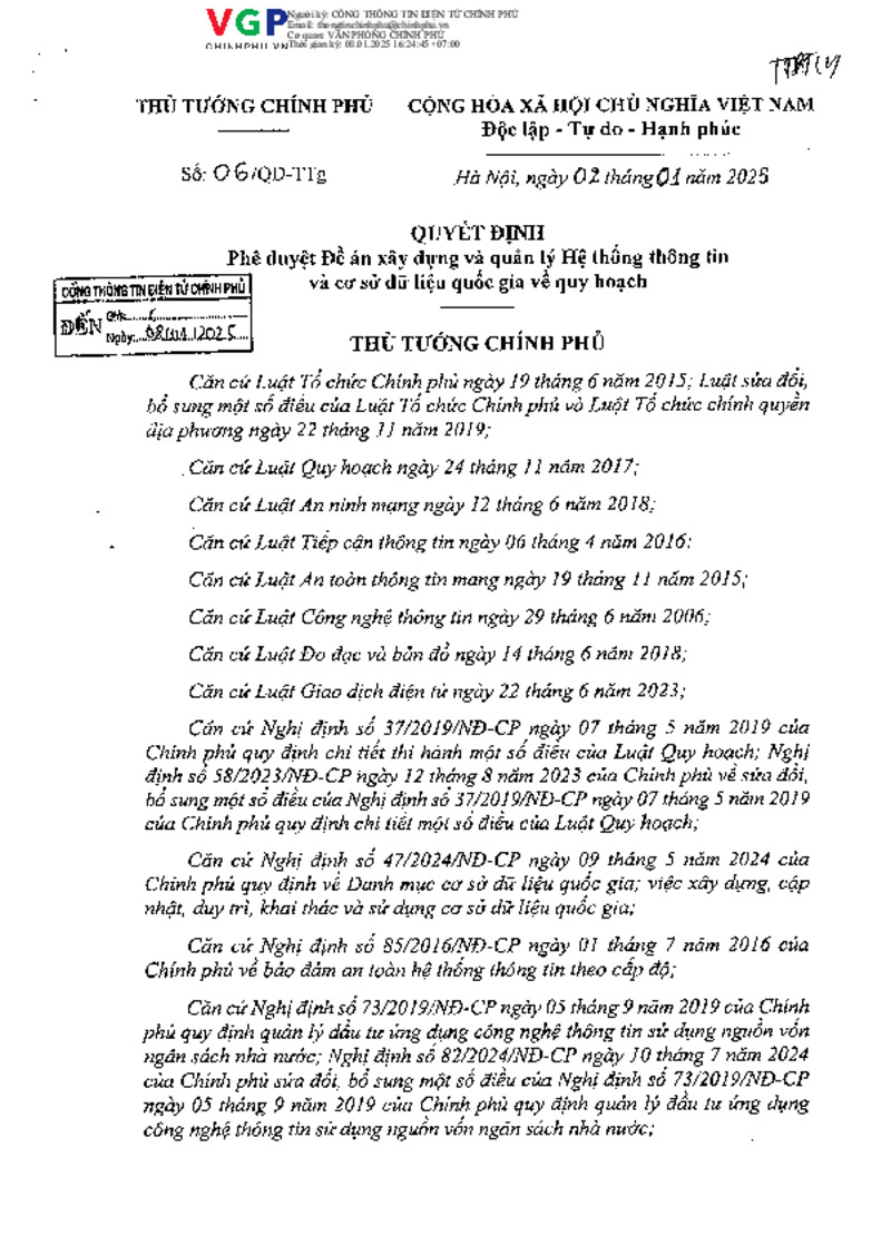 | Tiêu đề văn bản | Quyết định số 06/QĐ-TTg của Thủ tướng Chính phủ: Phê duyệt Đề án xây dựng và quản lý Hệ thống thông tin và cơ sở dữ liệu quốc gia về quy hoạch | ||