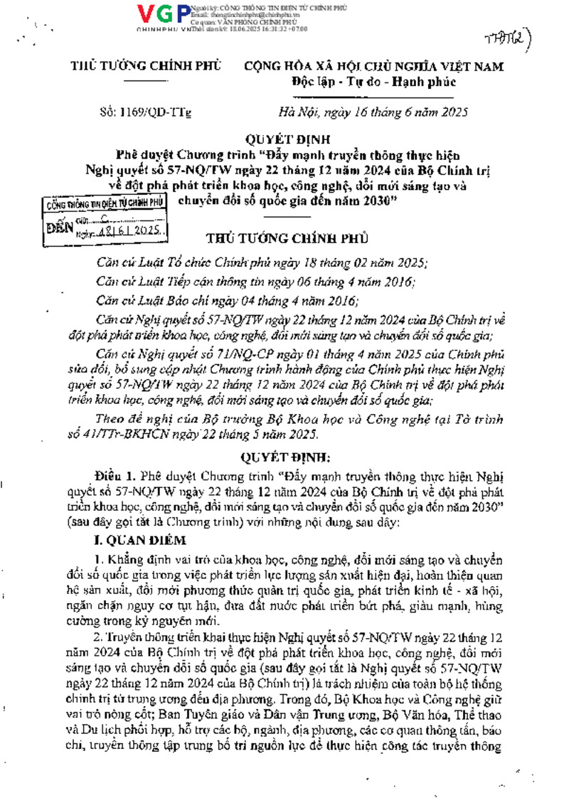 | Tiêu đề văn bản | Quyết định số 1169/QĐ-TTg của Thủ tướng Chính phủ: Phê duyệt Chương trình “Đẩy mạnh truyền thông thực hiện Nghị quyết số 57-NQ/TW ngày 22 tháng 12 năm 2024 của Bộ Chính trị về đột phá phát triển KHCN, đổi mới sáng tạo và CĐS QG đến năm 2030” | ||