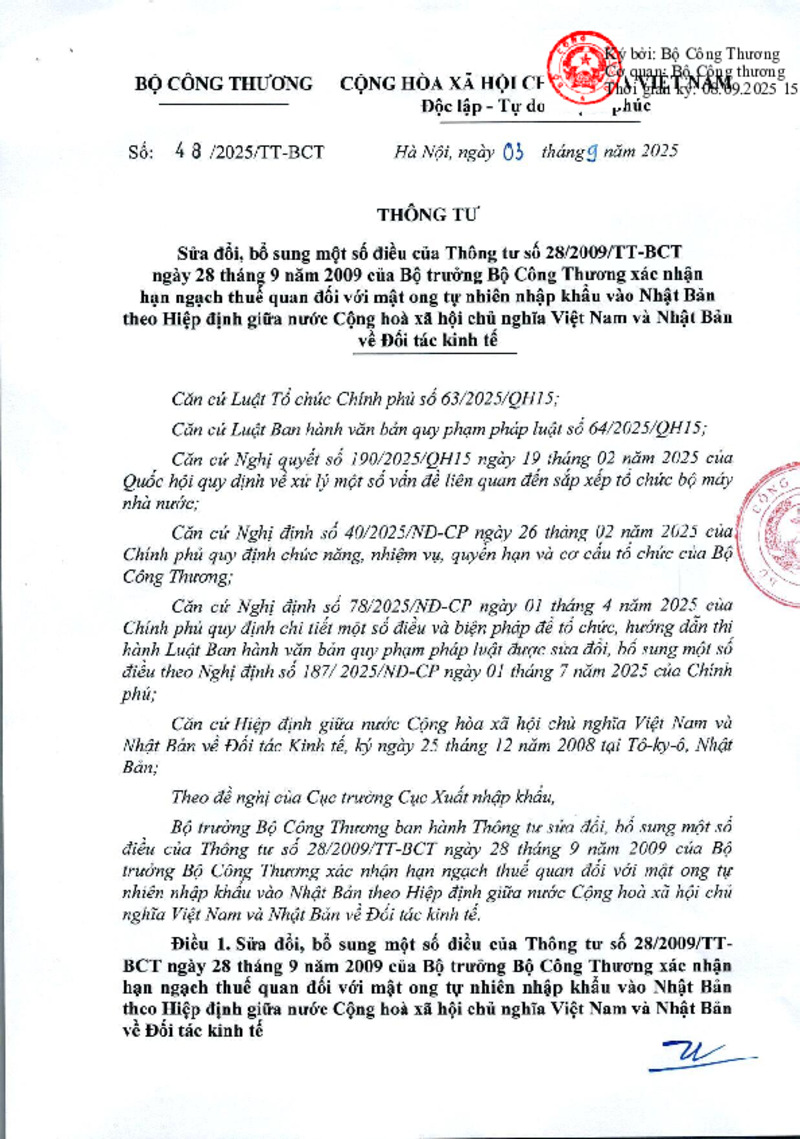 Ngày 03/9/2025, Bộ Công Thương đã ban hành Thông tư số 48/TT-BCT về Sửa đổi, bổ sung một số điều của Thông tư 28/2009/TT-BCT ngày 28/9/2009 của Bộ Công Thương xác nhận hạn ngạch thuế quan đối với mật ong tự nhiên nhập khẩu vào Nhật bản theo Hiệp định giữa nước Cộng hòa xã hội chủ nghĩa Việt Nam và Nhật bản về Đối tác kinh tế. Thông tư quy định Uỷ ban nhân dân cấp tỉnh thực hiện việc xác nhận Giấy chứng nhận hạn ngạch thuế quan trong vòng 03 ngày làm việc,…